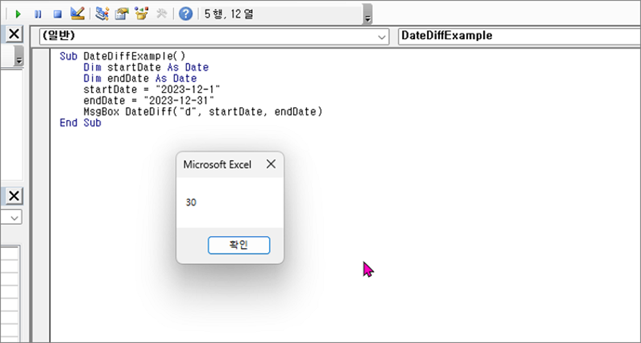 예제에서는 2023년 12월 1일부터 2023년 12월 31일까지의 일수 차이를 “DateDiff” 함수로 계산합니다. 실행 결과, 메시지 박스에는 "30"이 출력됩니다.