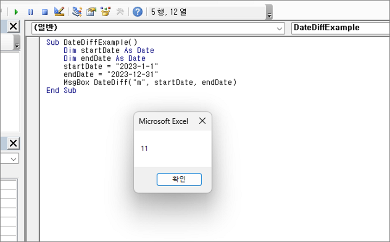 예제에서는 2023년 1월 1일부터 2023년 12월 31일까지의 월수 차이를 “DateDiff” 함수로 계산합니다. 실행 결과, 메시지 박스에는 "11"이 출력됩니다.