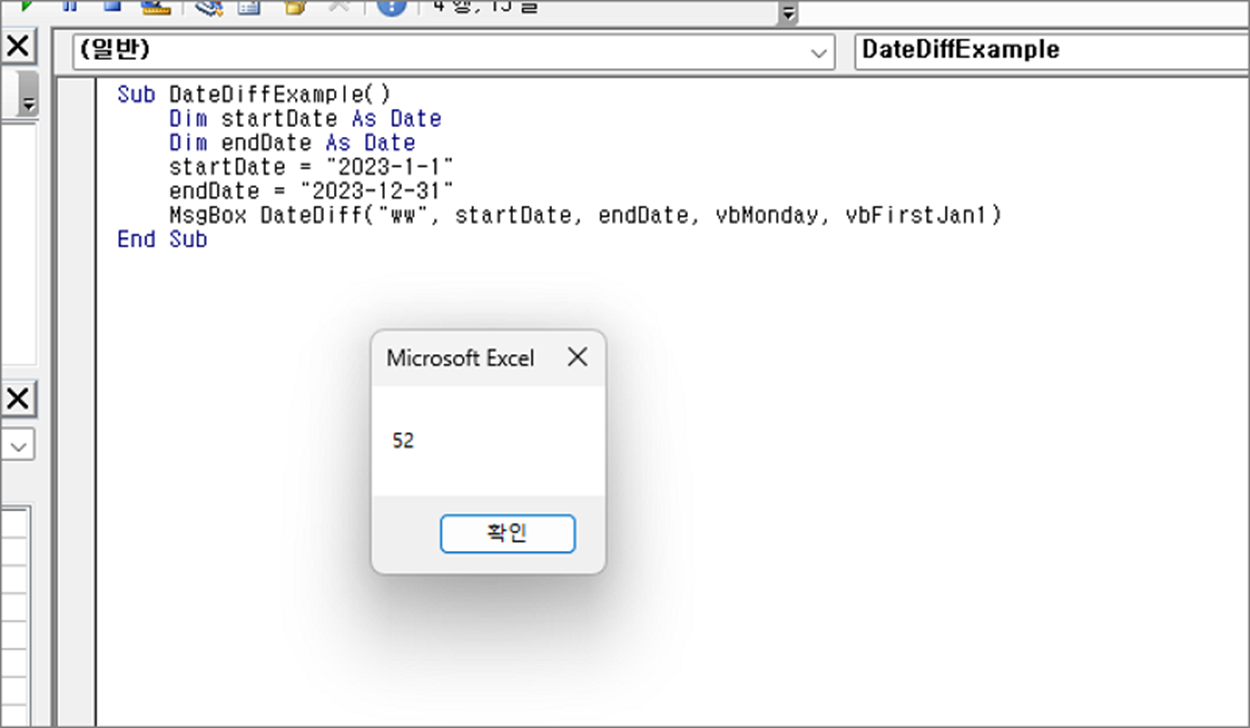 예제에서는 2023년 1월 1일부터 2023년 12월 31일까지의 주수 차이를 “DateDiff” 함수로 계산하되, 주의 첫 번째 날을 월요일로, 연도의 첫 번째 주를 1월 1일을 포함하는 주로 지정합니다. 실행 결과, 메시지 박스에는 "52"를 출력합니다.