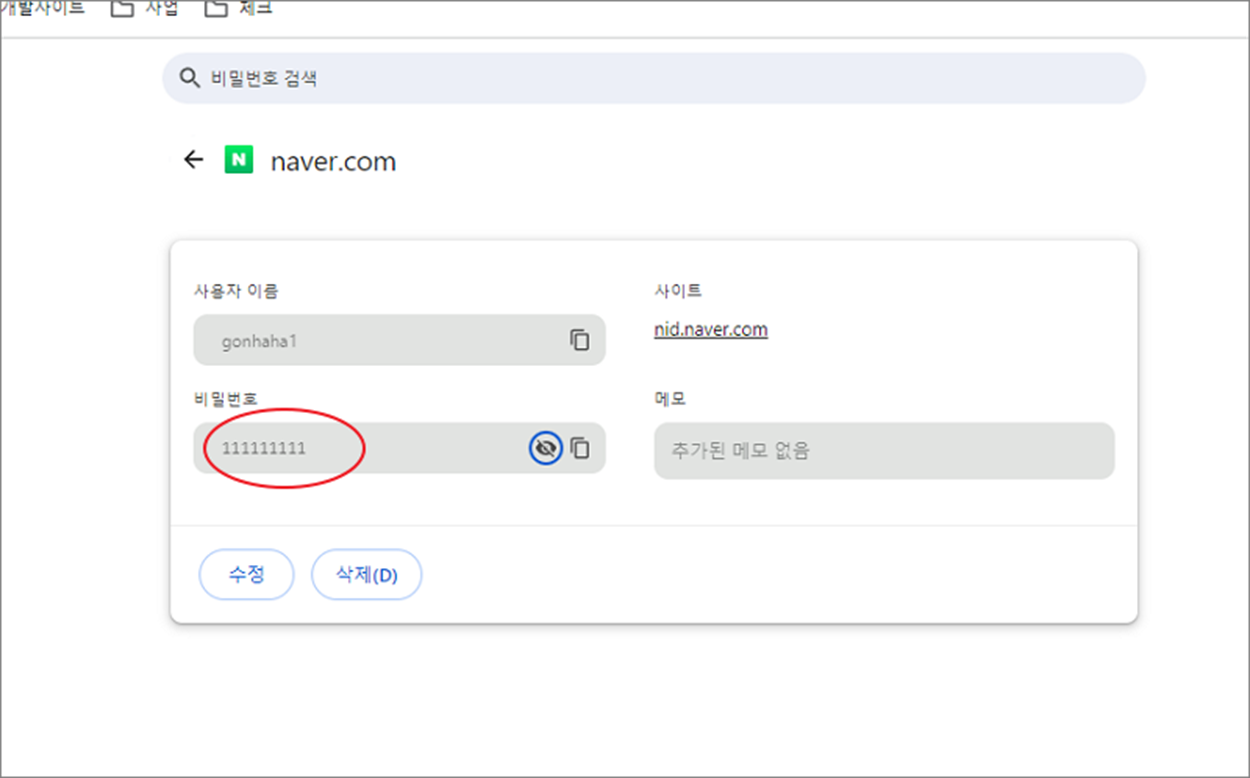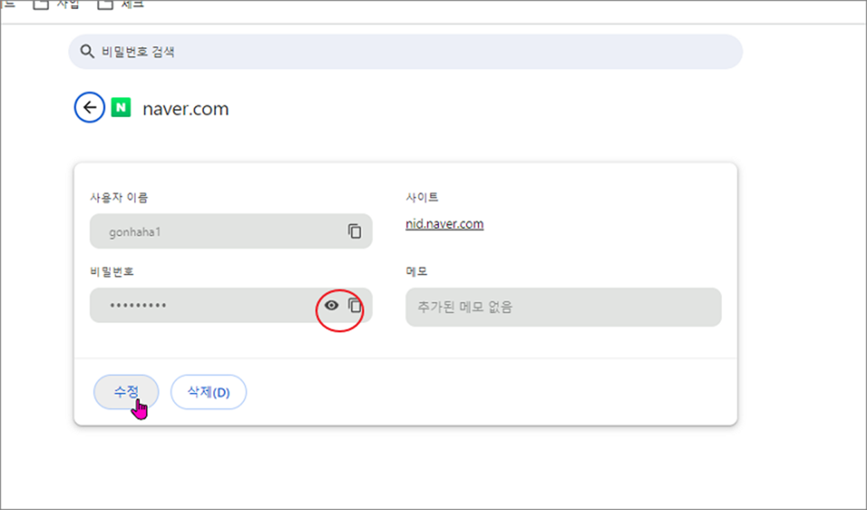 ▼ 해당 사이트 상세 페이지에는 등록할 때 필요한 사이트 주소와 아이디, 패스워드 정보가 있습니다. 여기에서 비밀번호 입력란 오른쪽 끝에 보시면 눈 모양의 아이콘이 있습니다.
