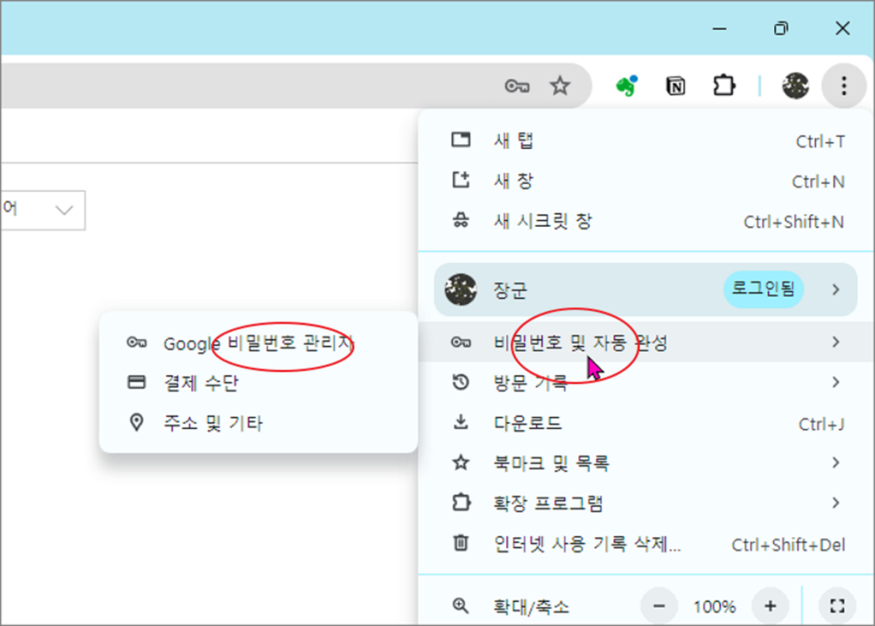 ▼ 또 다른 방법은 설정 > 비밀번호 및 자동 완성 > Google 비밀번호 관리 메뉴를 클릭해서 이동할 수 있습니다.