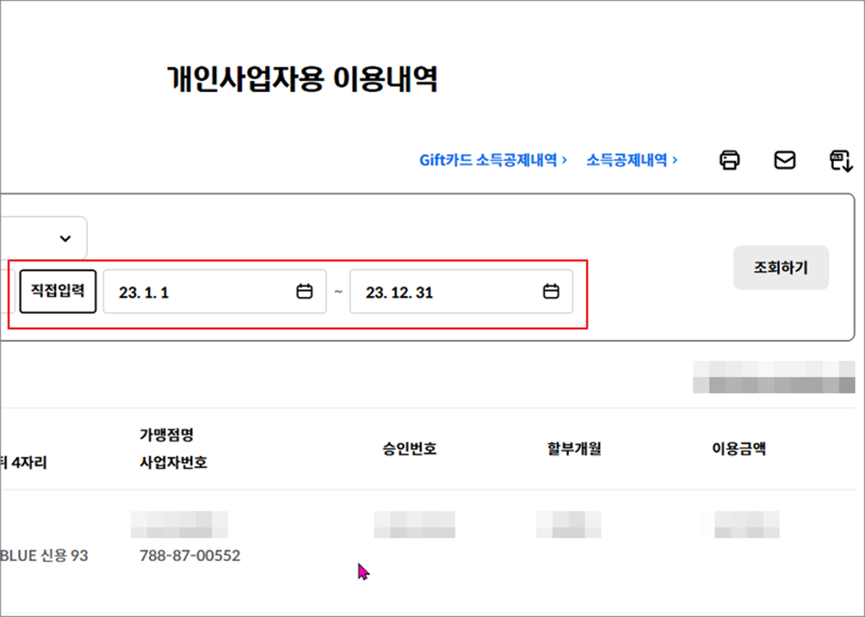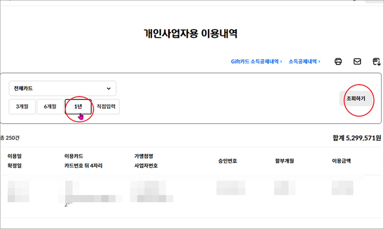▼ 그런데 “1년” 버튼을 눌러서 조회한 결과는 현재 사이트에 접속한 날짜로부터 1년이기 때문에 종합 소득세 납부날짜와는 일치하지 않습니다. 종합 소득세 납부를 위한 조회는 “직접입력” 버튼을 눌러서 작년도 시작일부터 종료일까지 입력하고 조회합니다.