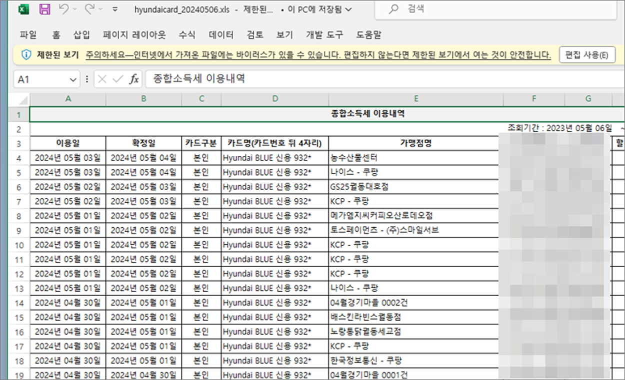 | 종합소득세신고 자료 현대카드 1년간 카드이용내역 엑셀로 다운받기 (0) | 2024.03.20 |