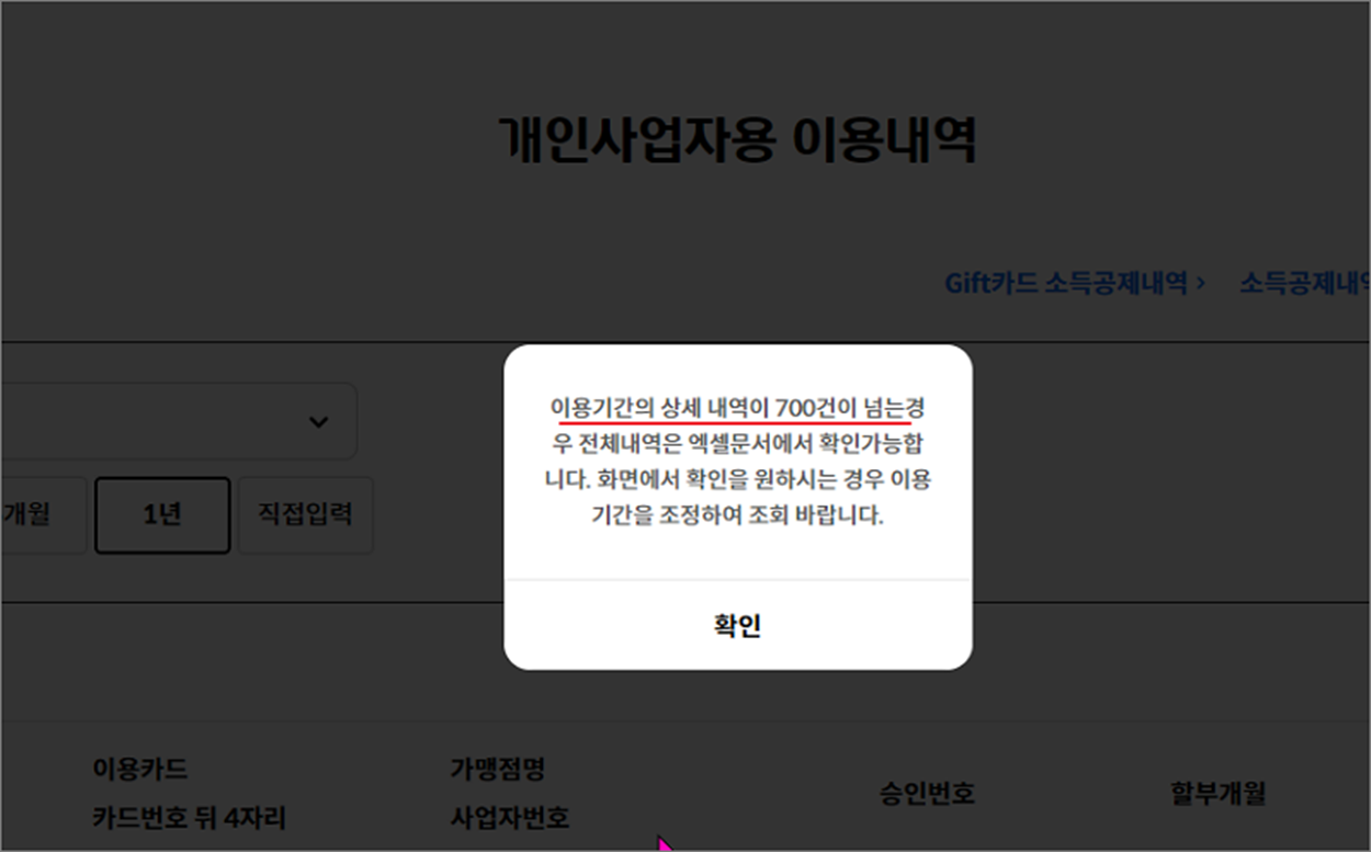 ▼ 이렇게 조회한 결과가 700건 이상일 경우 웹 페이지에서 다 보여주지 않습니다. 화면에 경고창의 내용처럼 700건 이상의 내용을 보고 싶은 경우 엑셀로 다운받아야 합니다.