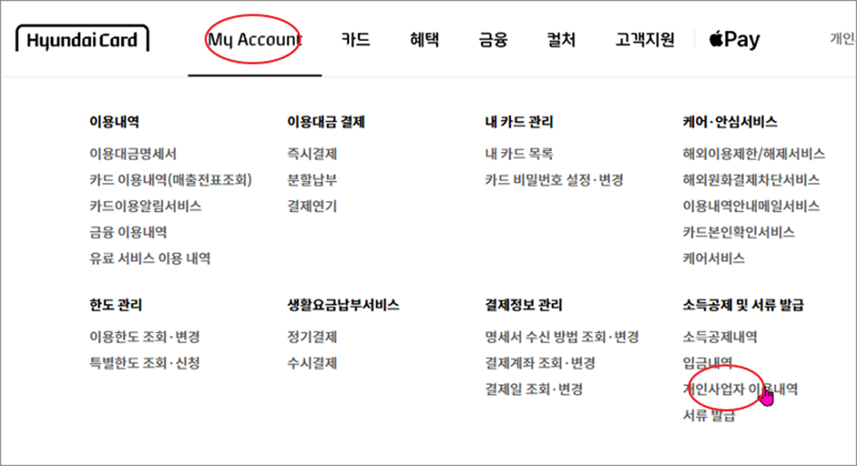 ▼ 먼저 현대카드 홈페이지로 접속합니다. 다음 상단 메뉴 My Account 를 마우스로 가져가면 하위 전체 메뉴가 화면에 나타납니다. 그리고 오른쪽 하단에 “소득공제 및 서류 발급” > “개인사업자 이용내역” 메뉴를 클릭합니다.