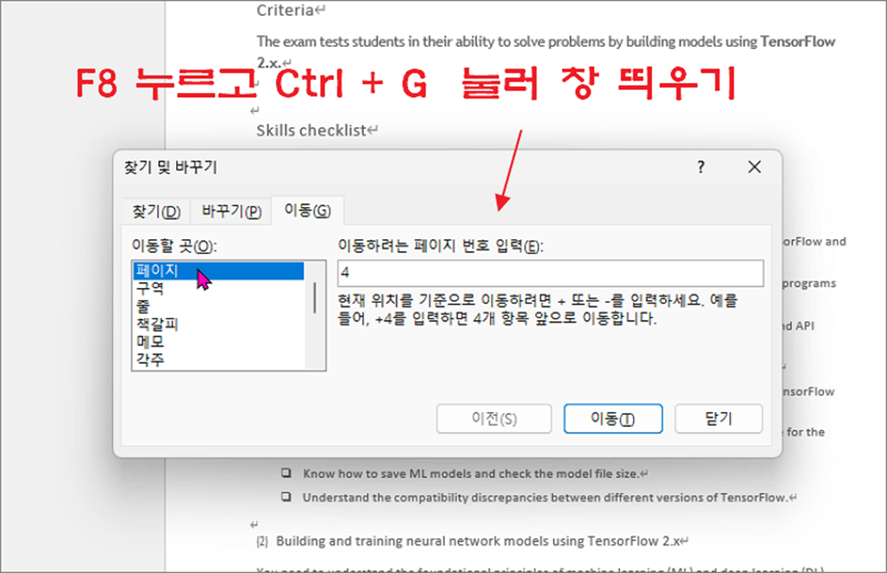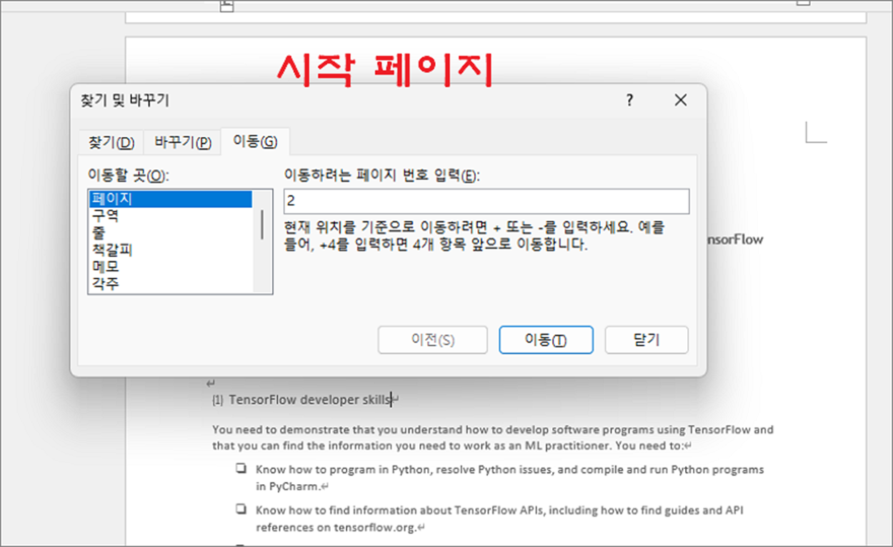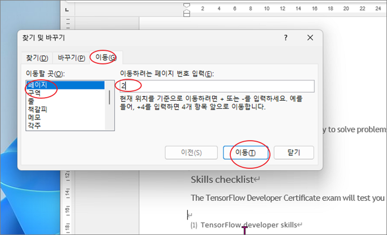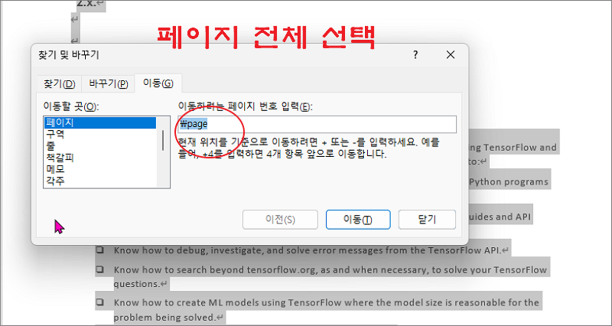 ▼ 다음은 찾기 및 바꾸기 창에서 페이지 이동과 선택으로 삭제하는 방법입니다. Ctrl + F 를 눌러 창을 띄우고 “이동” 탭으로 이동합니다. 그리고 “이동할 곳” 에서 “페이지” 항목을 선택하고 오른쪽으로 가서 삭제할 페이지 번호를 입력합니다. 화면 하단에 “이동” 버튼을 눌러 입력한 페이지로 이동합니다.