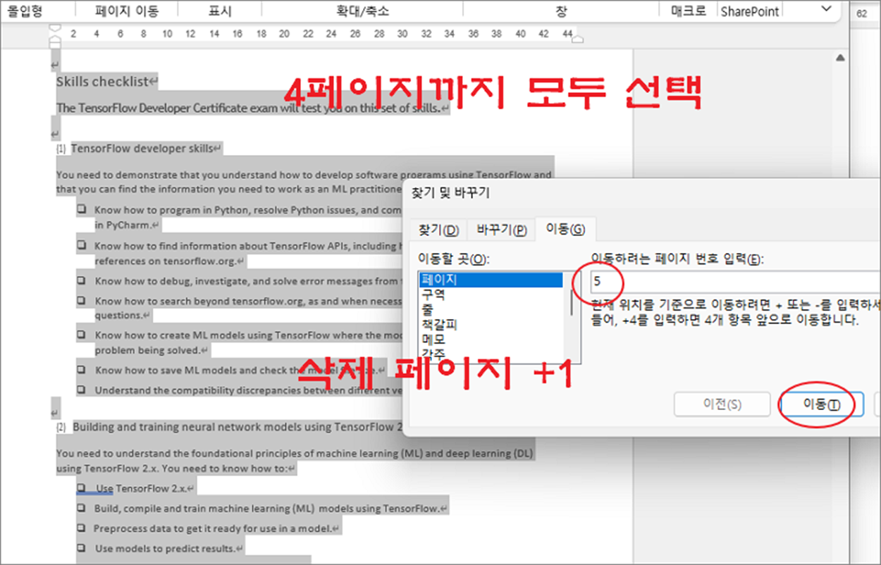 ▼ 이때 삭제 하고 싶은 페이지에서 1을 더해야 합니다. 예를 들어 이동 버튼을 클릭해서 2~4 페이지를 삭제하고 싶다면 입력은 5로 해 줍니다. 왜냐하면 마지막 페이지의 첫 시작 지점을 선택해 주기 때문입니다.