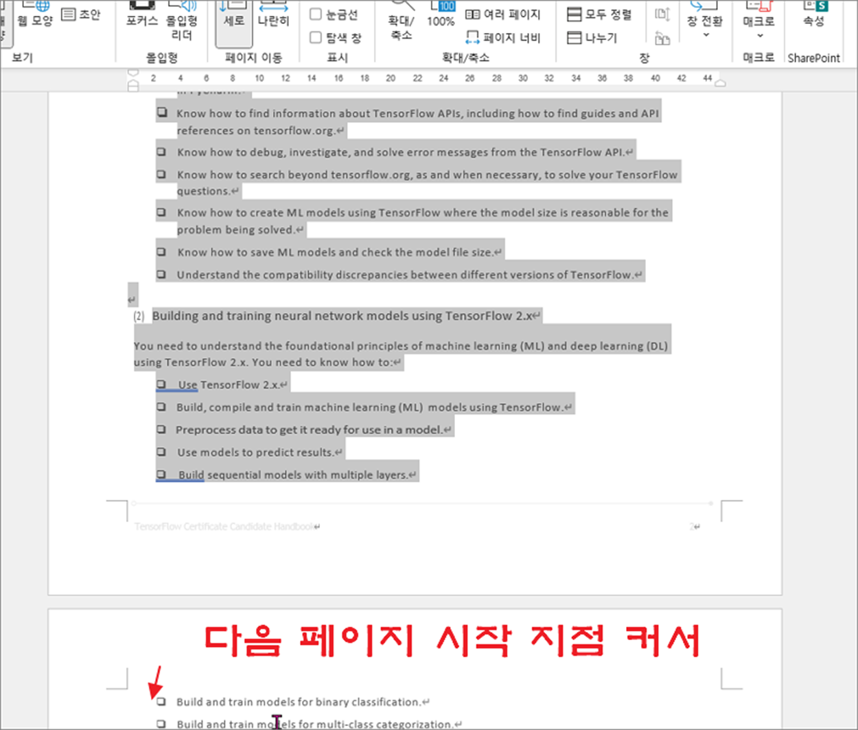 ▼ 삭제하고 싶은 페이지 처음에 커서를 두고 마우스로 드래그하거나 Shift 키를 누른 상태에서 페이지 끝까지 선택합니다.