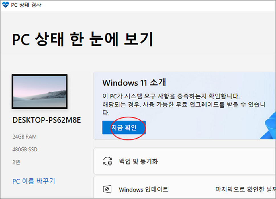 ▼ 프로그램을 실행하면 아래 그림과 같은 화면이 나타납니다. 여기에서 화면에 “지금 확인” 버튼을 눌러 업그레이드 가능 여부 확인을 시작합니다.