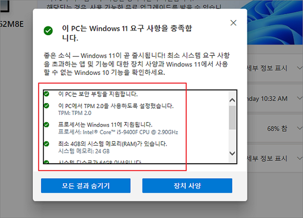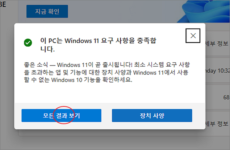 ▼ 그림처럼 팝업창에 결과가 나타나는데 저의 경우 모든 요구사항을 충족한다고 하네요. 만약 요구 사항을 만족하지 않은 결과가 나온다면 아래 “모든 결과 보기” 버튼을 눌러 상세 내역을 확인합니다.