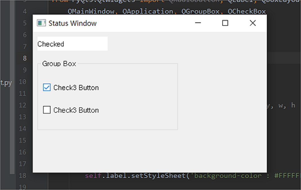 ▼ QCheckBox 의 체크여부를 표시할 QLabel 객체를 생성합니다.
