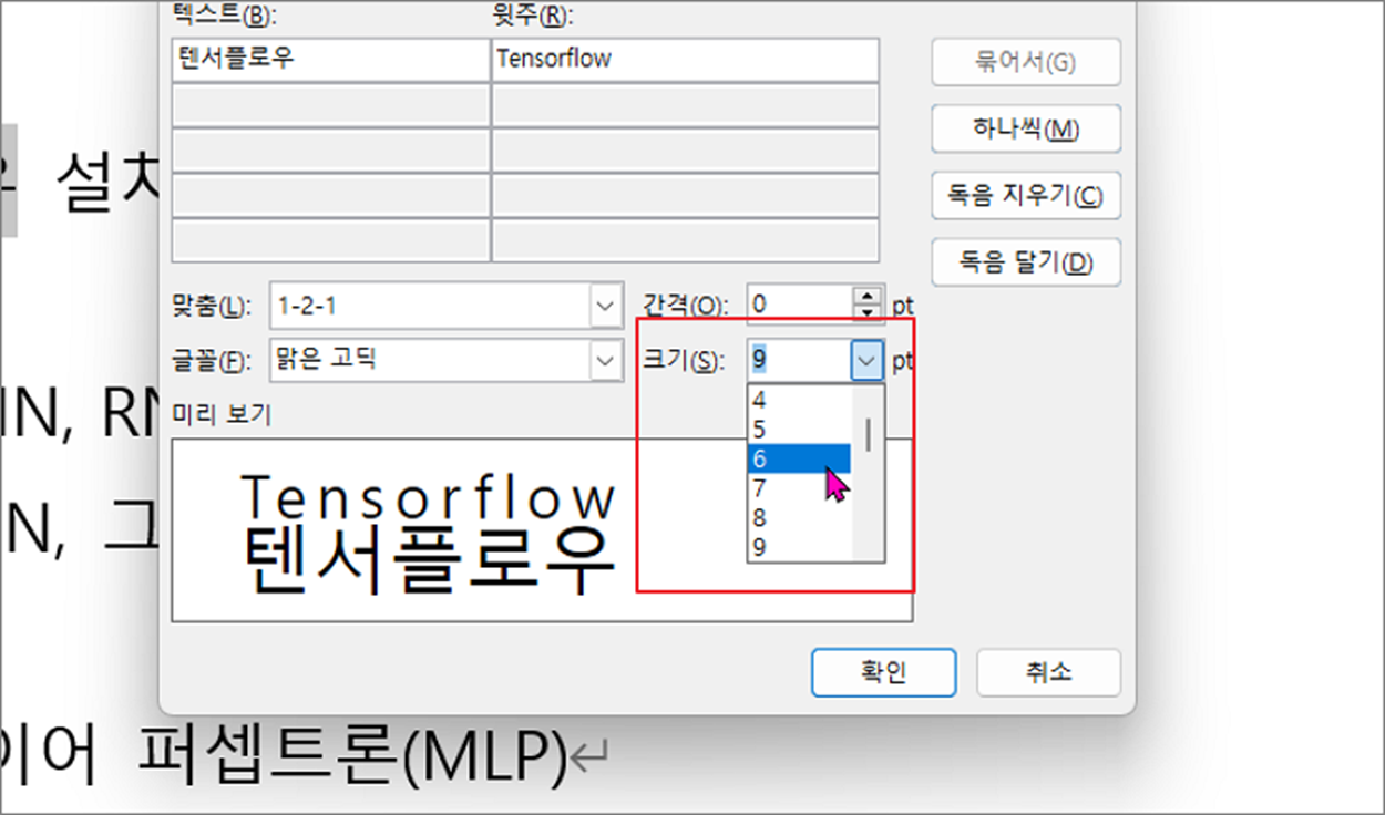 ▼ 단어가 한글자로 모였으면 아래로 내려가서 윗주로 입력할 텍스트의 서식을 조절해 보세요. “크기” 옵션은 윗주로 입력할 텍스트의 폰트 크기를 말합니다.