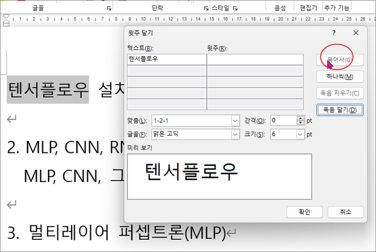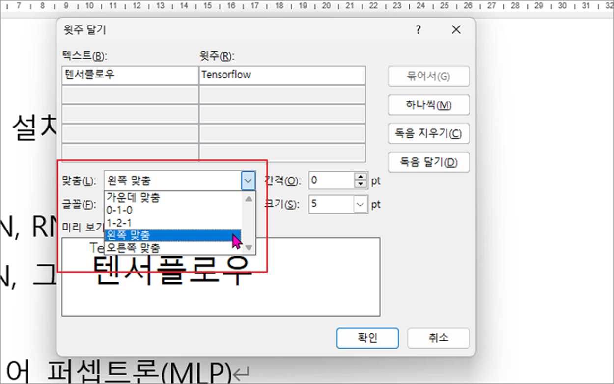 ▼ 아래 그림은 맞춤옵션에서 [왼쪽 맞춤] 을 선택한 결과 입니다. 이상으로 워드에서 단어에 윗주기능을 사용하는 방법에 대해 알아 보았습니다.