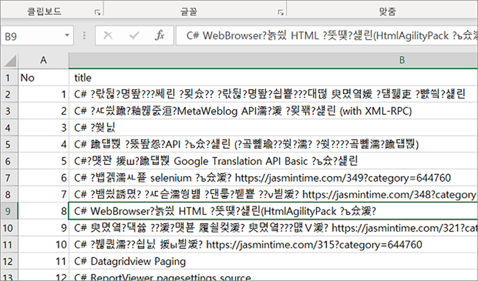 file.WriteLine("No, title, url"); // 헤더 설정