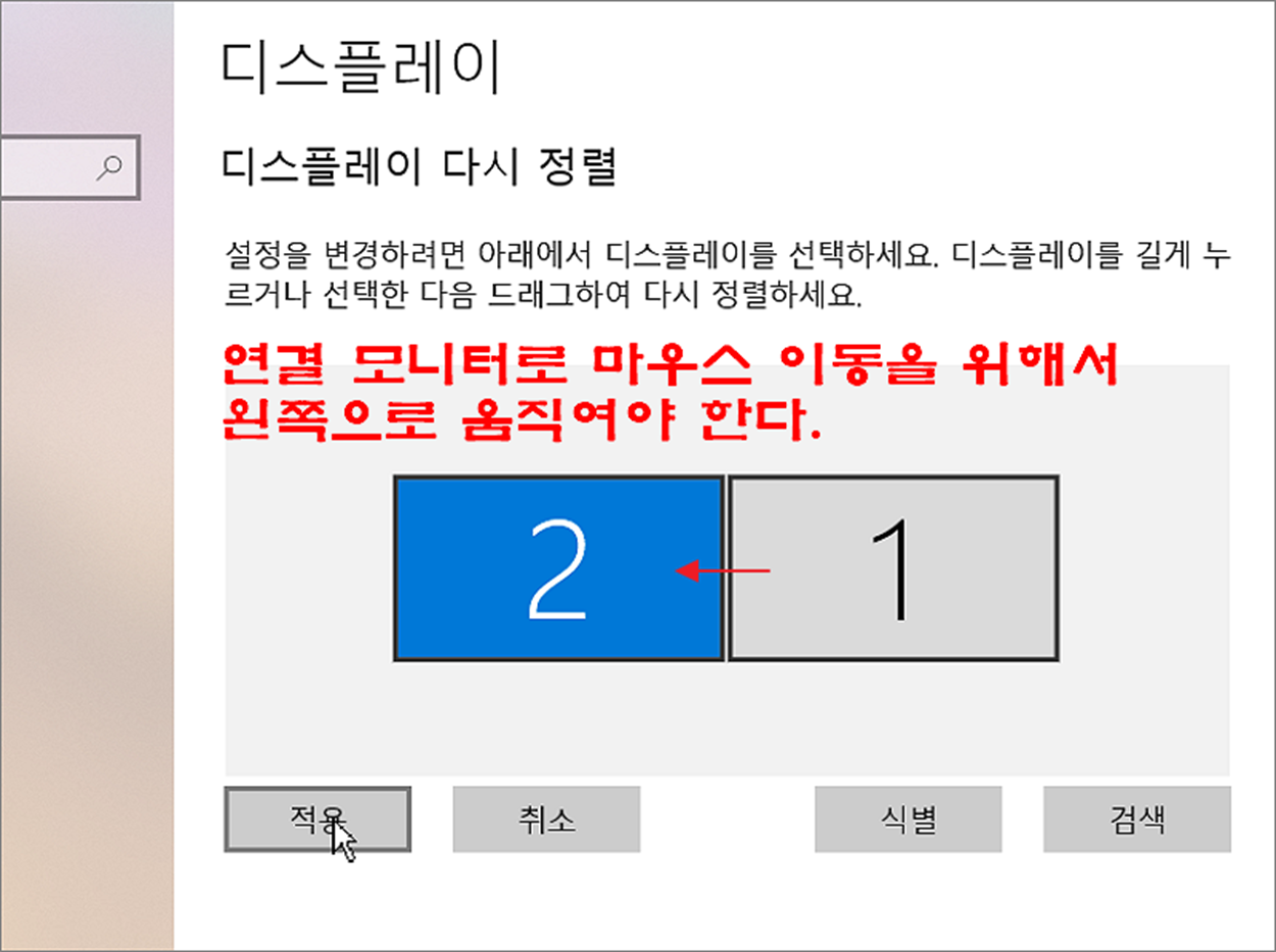 ▼ 모니터의 배치와 마우스 이동 경로에 따라 두 모니터 박스를 드래그해서 옮겨 줍니다.