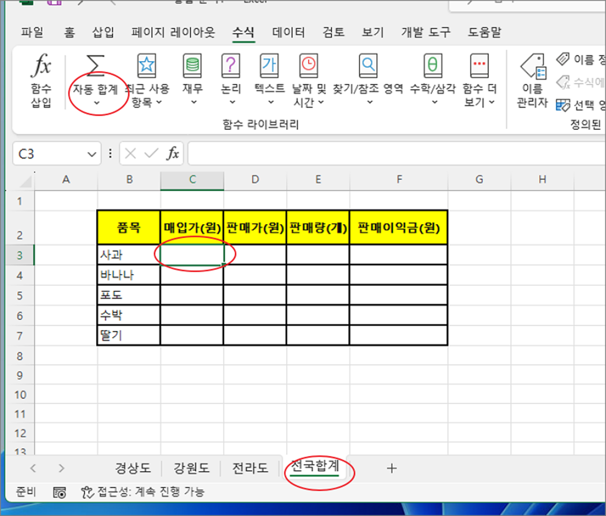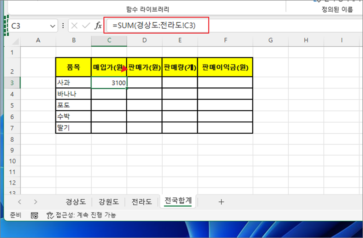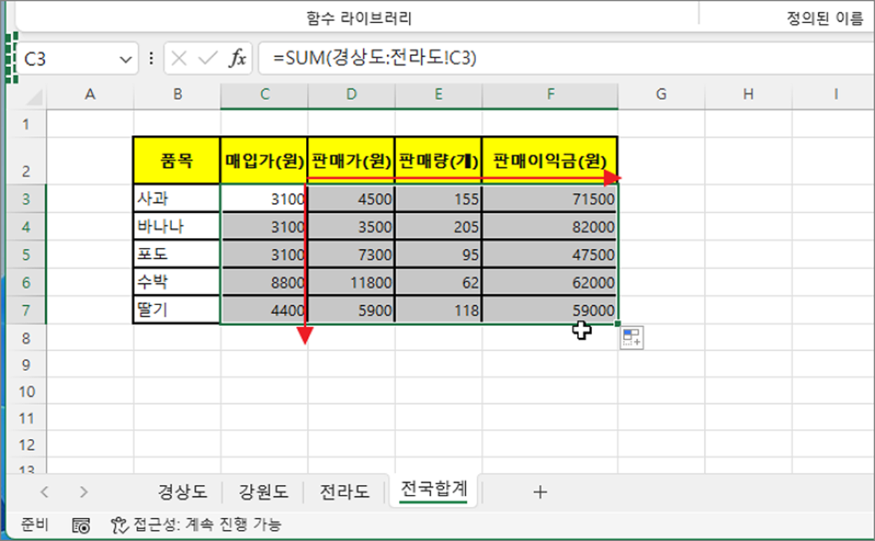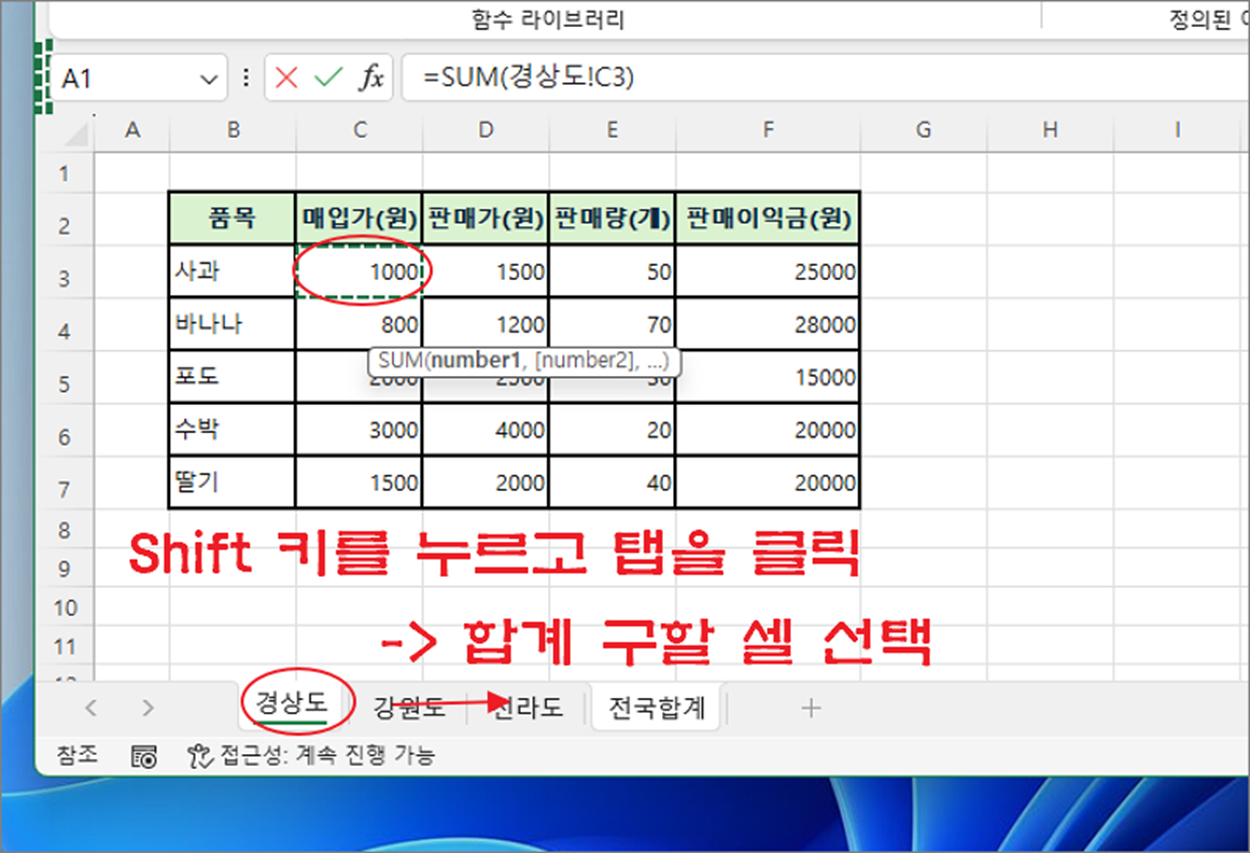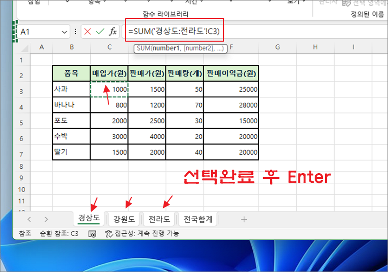 ▼ 첫번째 셀 위치를 클릭한 다음 부터는 Shift 키를 누른 상태에서 모든 탭에 동일한 셀 위치를 선택합니다. 이렇게 선택이 끝나면 “경상도” 에서 “전라도” 까지의 “C3” 셀을 뜻하는 “경상도:전라도!C3” 가 파라미터로 들어갈 것입니다. SUM 함수의 파라미터를 확인하고 Enter 를 누릅니다.