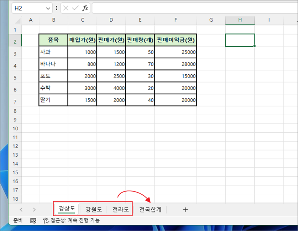 ▼ “전국합계” 탭에는 3개의 탭에 있는 데이터를 합친 결과가 셀에 나타납니다. 첫 번째 식을 만들었으므로 다른 셀에 수식을 드래그해서 한번에 적용해 보겠습니다.