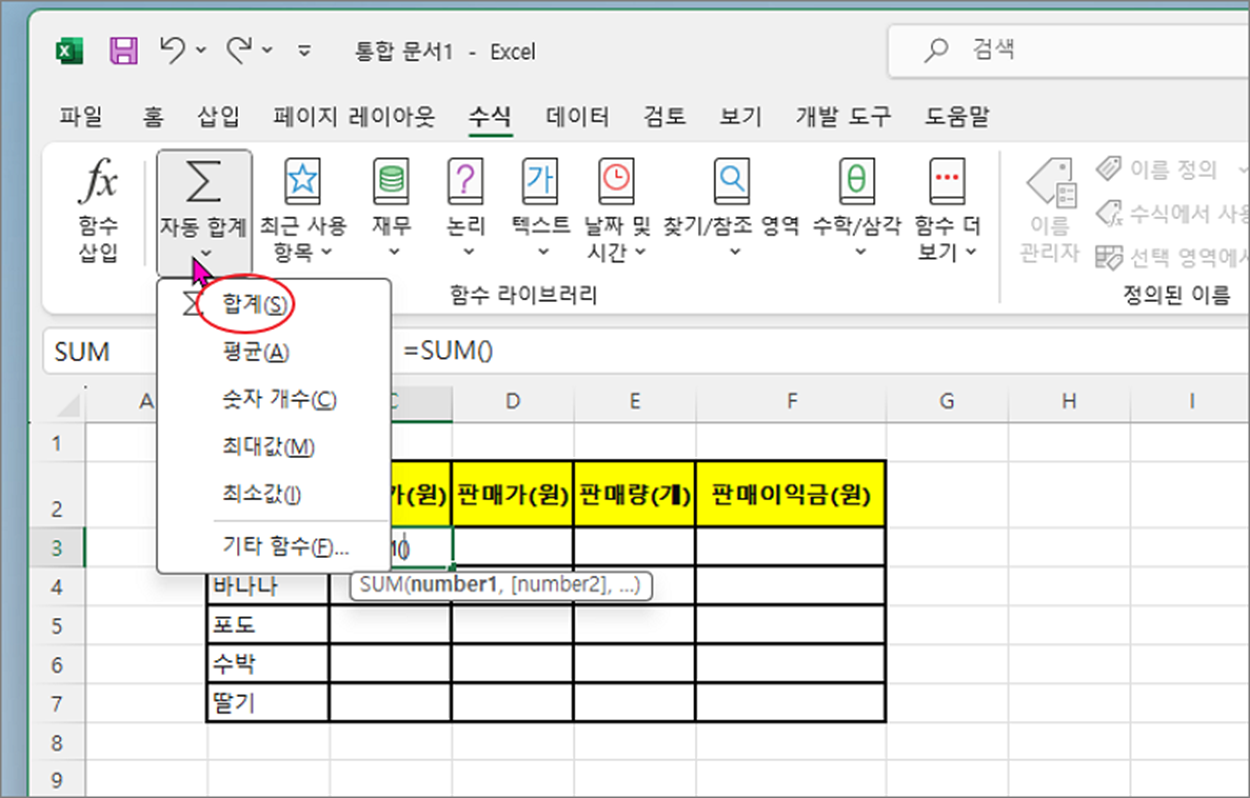 ▼ 자동 합계 메뉴에서 “합계” 를 선택합니다. 셀에는 SUM 함수가 입력되고 커서 위치가 인수입력 위치에서 깜박거릴 겁니다.