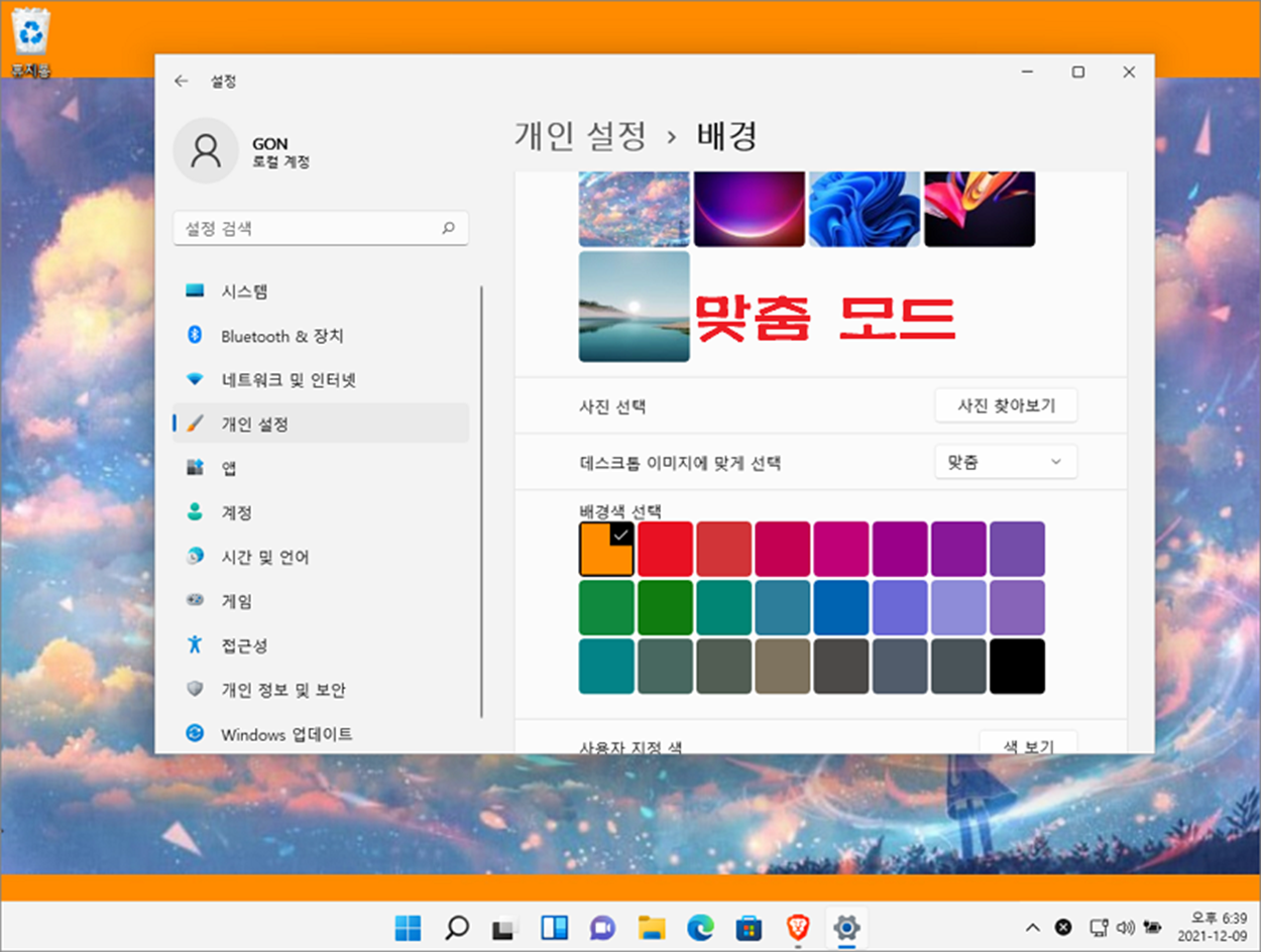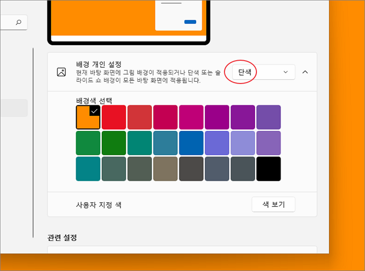 ▼ 다음은 시각적인 방해 요소를 최소화하여 집중력을 향상시킬 수 있는 단색 모드입니다. 화면을 사용자가 선택한 색상을 단색으로 채웁니다. “배경 개인 설정” 옵션에서 “단색” 으로 선택합니다. 그리고 아래 배경색 목록에서 원하는 색상을 선택합니다.