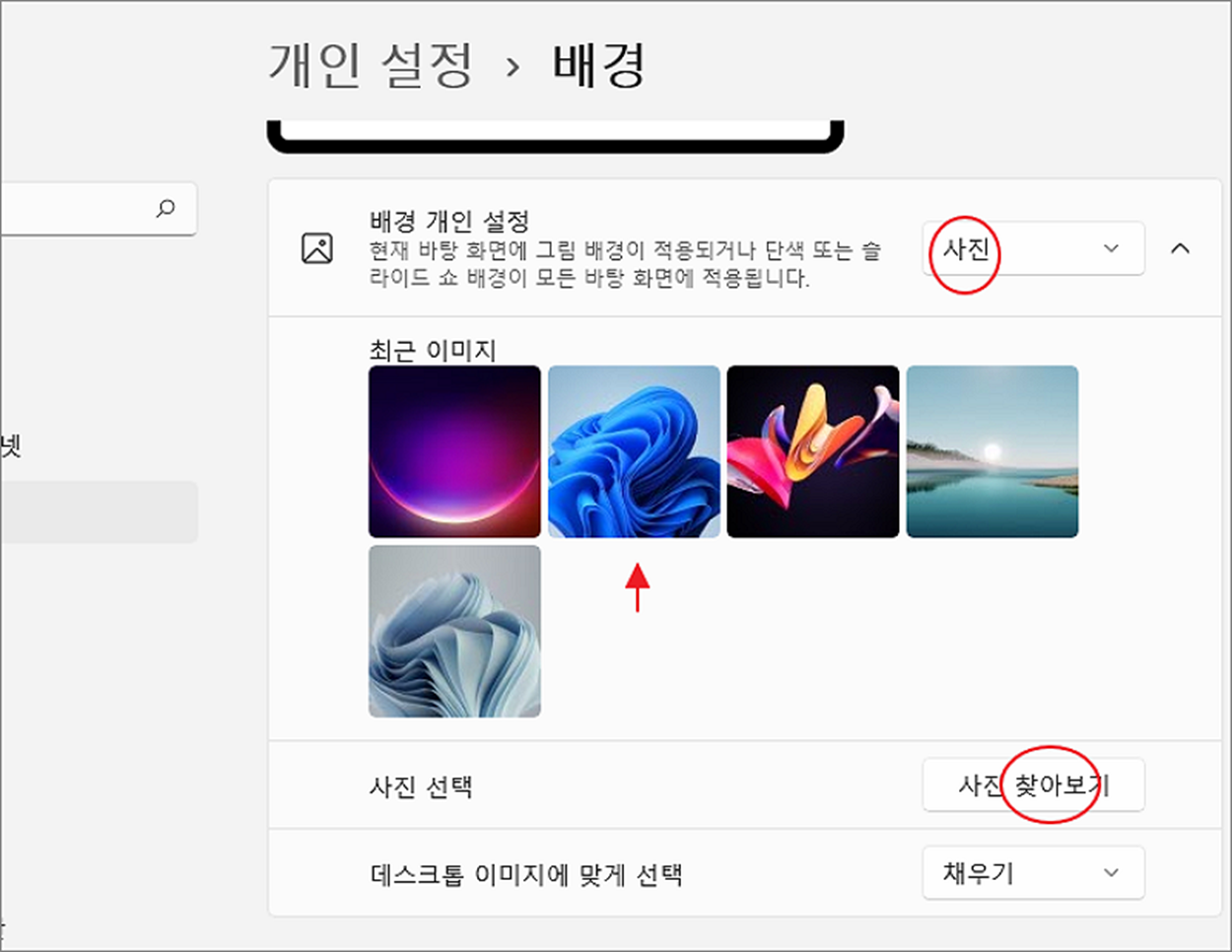 ▼ 바탕화면에 배경을 변경하는 방법은 3가지 입니다. 첫 번째는 방법은 “사진” 입니다. 기본적으로 제공하는 이미지를 선택하거나 배경으로 사용할 이미지를 준비 했다면 아래 사진 찾아보기 를 눌러 추가합니다.