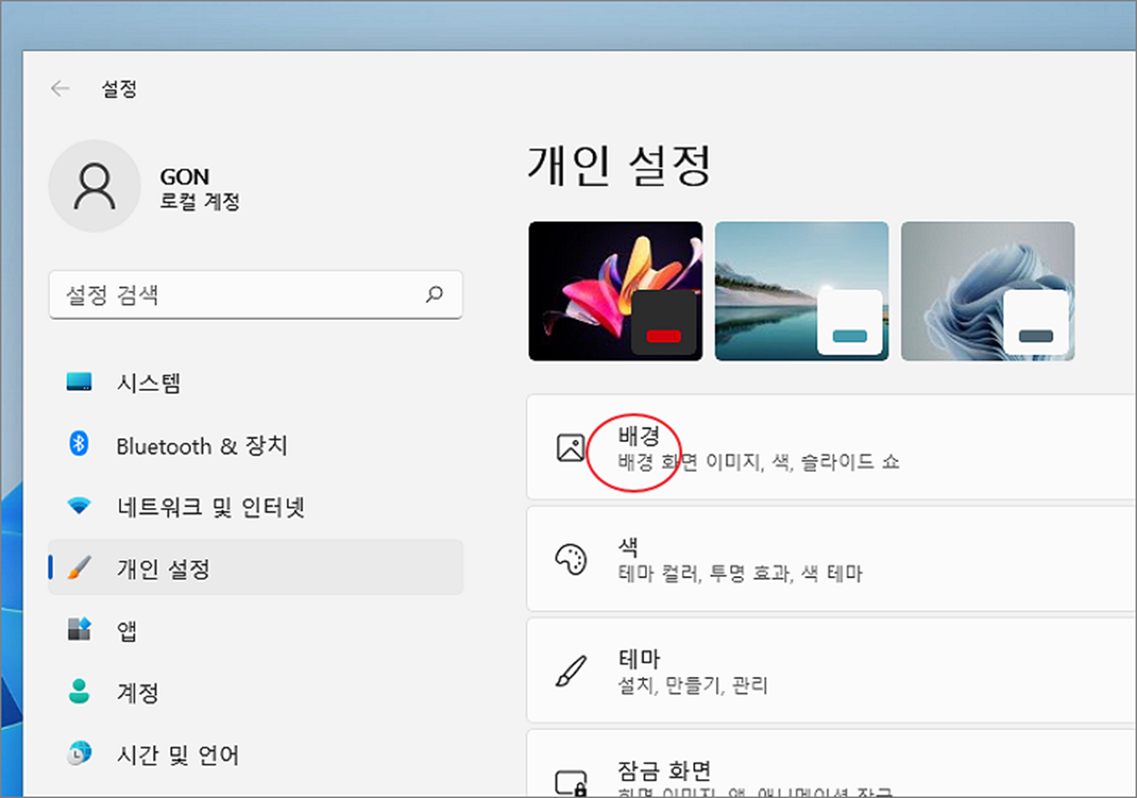 ▼ 개인 설정 화면으로 이동하시면 오른쪽 화면으로 이동하셔서 제일 상단에 “배경” 메뉴를 클릭합니다.