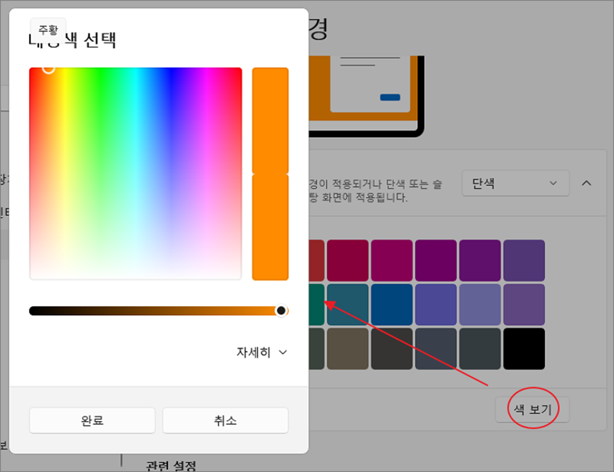 ▼ 목록에서 마음에 드는 색이 없다면 “색 보기”를 통해 원하는 색상을 찾아 등록할 수 있습니다.
