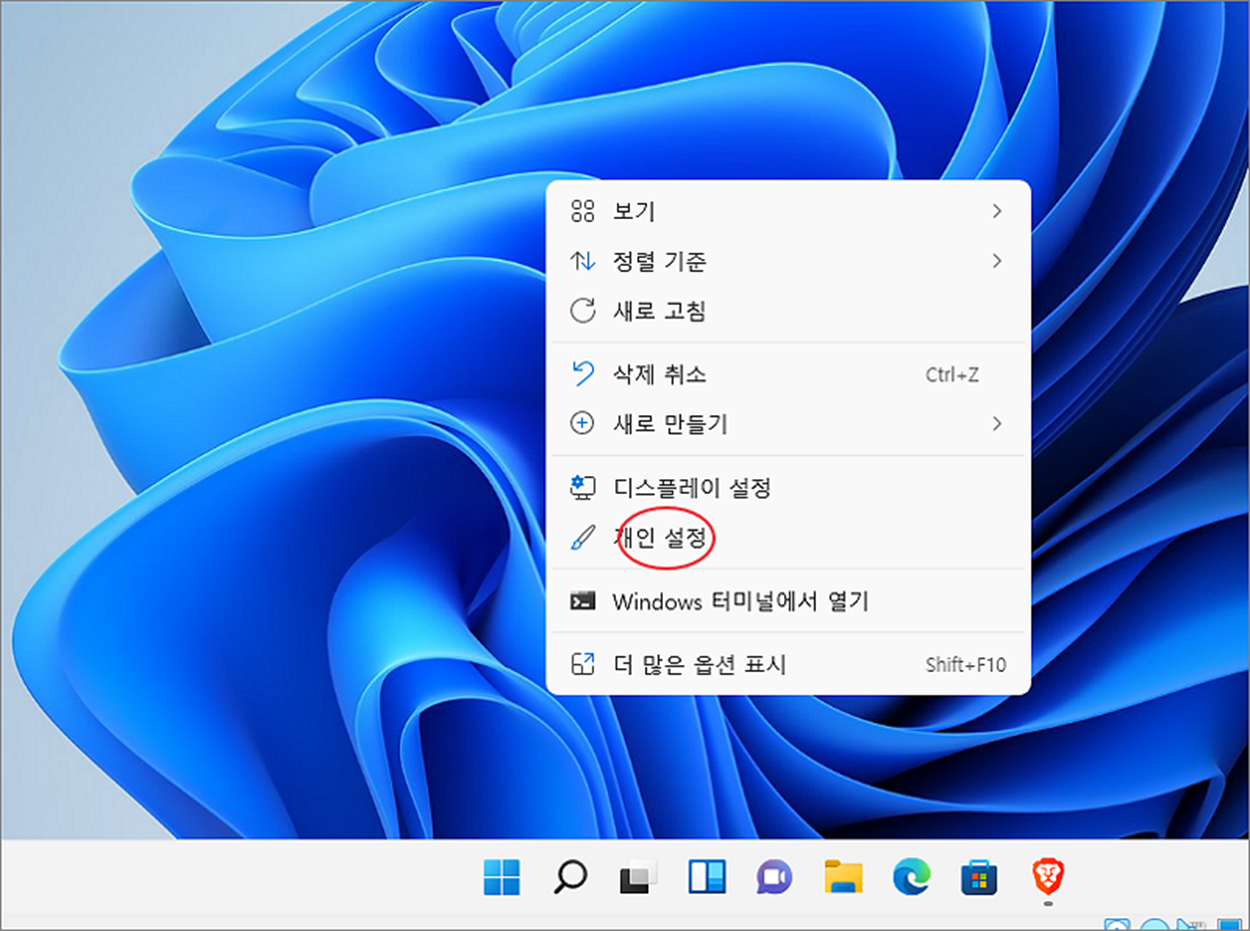 ▼ 배경 화면을 변경하고 싶다면 바탕화면에서 오른쪽 마우스 > 개인 설정 메뉴를 선택합니다.