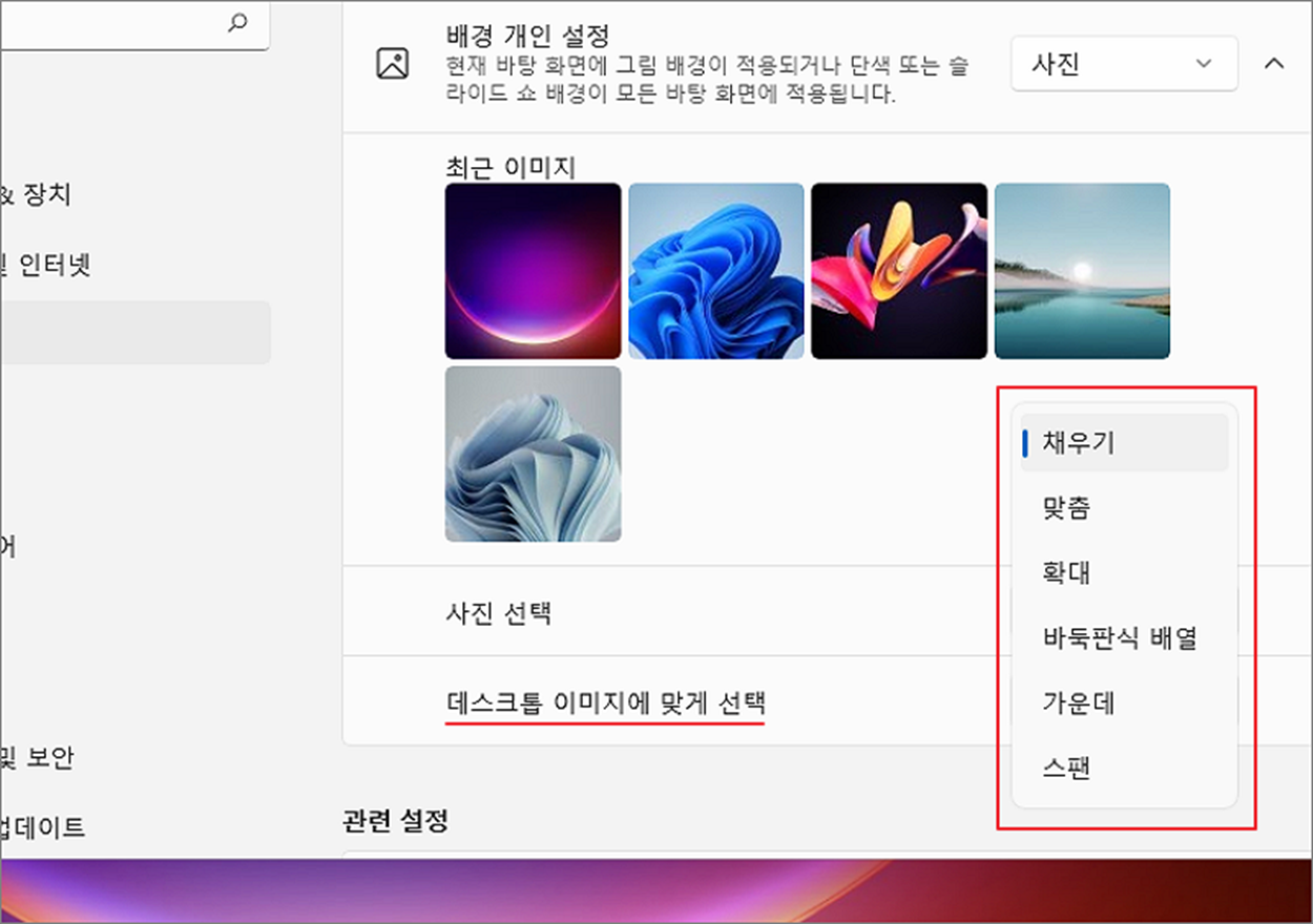 ▼ 추가한 사진은 크기가 다양하기 때문에 바탕화면에 딱 들어맞지는 않습니다. 그래서 오른쪽 다양한 이미지 표현 옵션을 제공합니다.