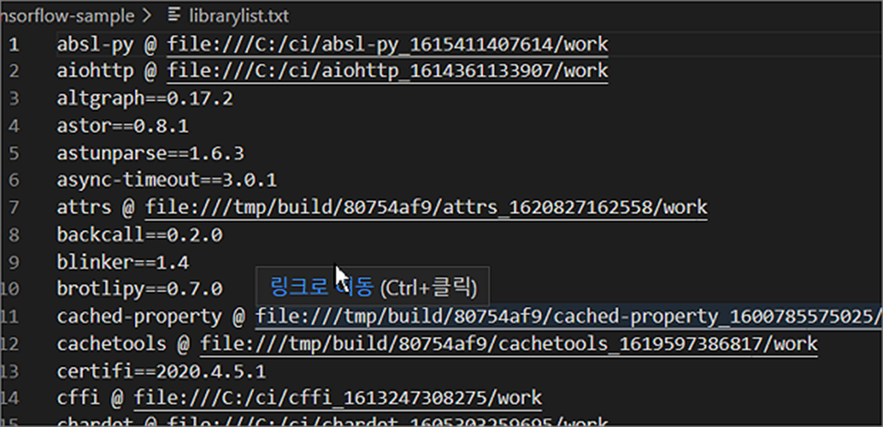 목록 정보는 pip freeze 를 이용해서 파일로 저장합니다. 파일명은 사용자가 임으로 정해도 됩니다. 파일의 내용은 pip freeze 명령어로 조회한 것과 같습니다.