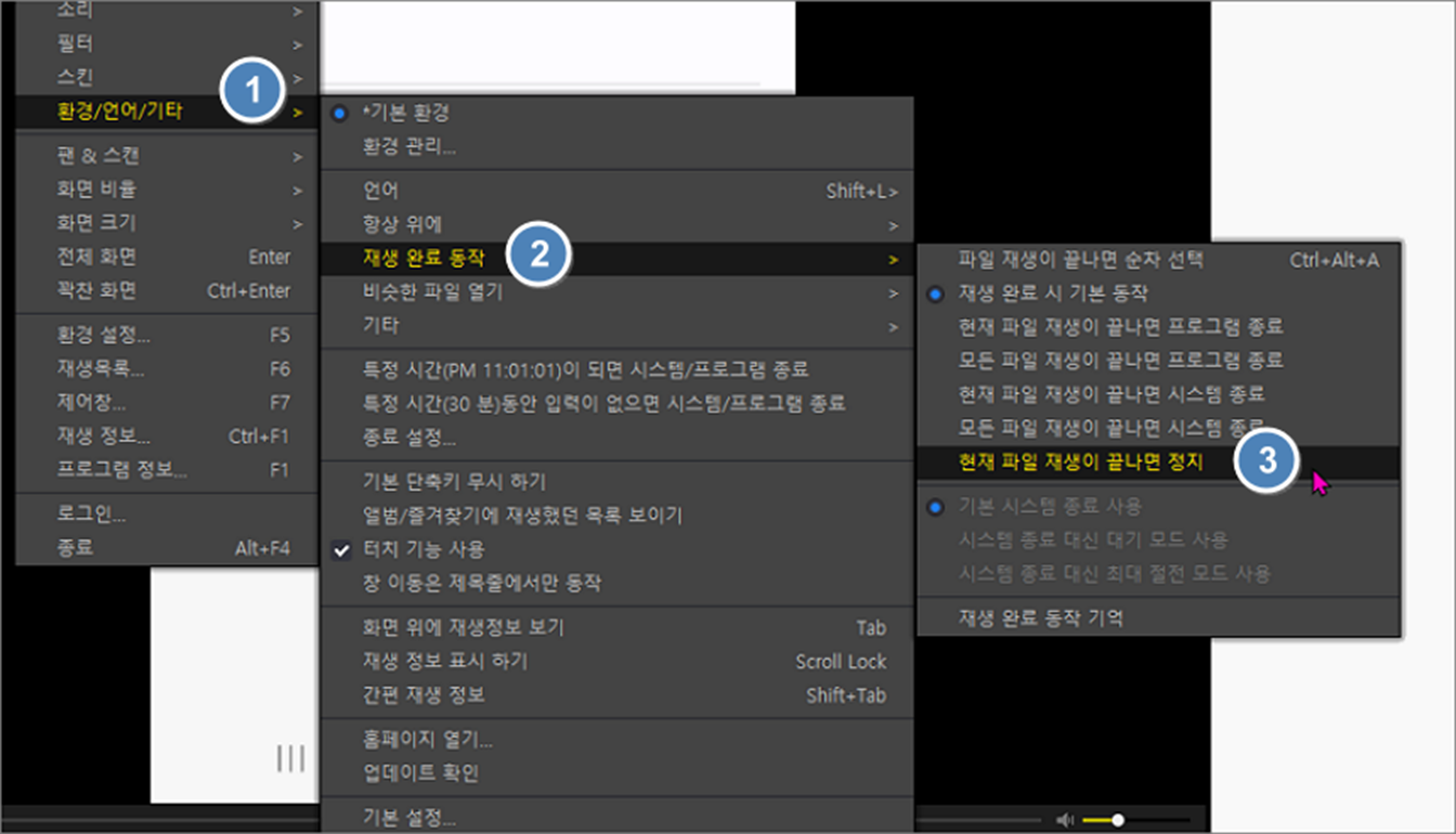 ▼ 환경/언어/기타 에서 두 번쨰 하위 메뉴로 “재생 완료 동작” 을 선택합니다. 마지막으로 “재생 완료 시 기본 동작” 메뉴를 “현재 파일 재생이 끝나면 정지” 로 선택합니다. 이상으로 설정이 끝났습니다.