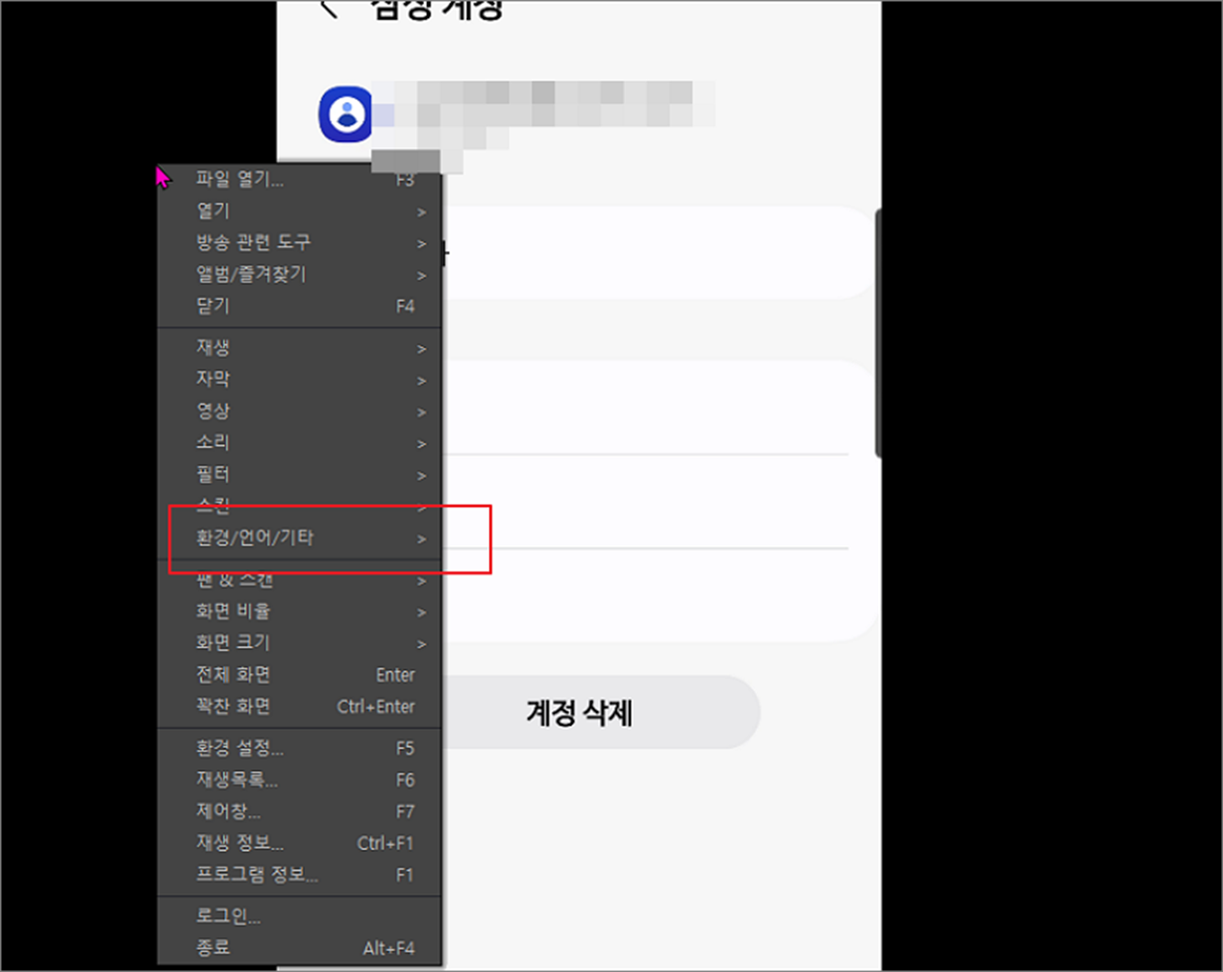 ▼ 연속 재생을 멈추고 싶다면 F9 나 화면에서 오른쪽 마우스를 클릭하고 메뉴 목록을 띄웁니다. 그리고 메뉴 목록에서 “환경/언어/기타” 를 선택합니다.