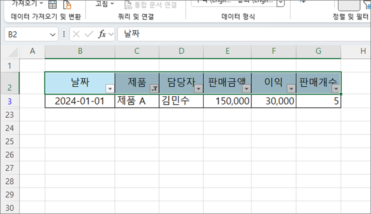 ▼ 오늘은 숫자와 텍스트 조건을 넣어서 그에 맞는 데이터만 표시하는 방법을 알아보겠습니다. 우선 데이터 범위에서 타이틀이 있는 헤더 부분에 필터를 적용하겠습니다. 헤더를 선택하고 테이터 탭 > 필터 리본 메뉴를 클릭합니다.
