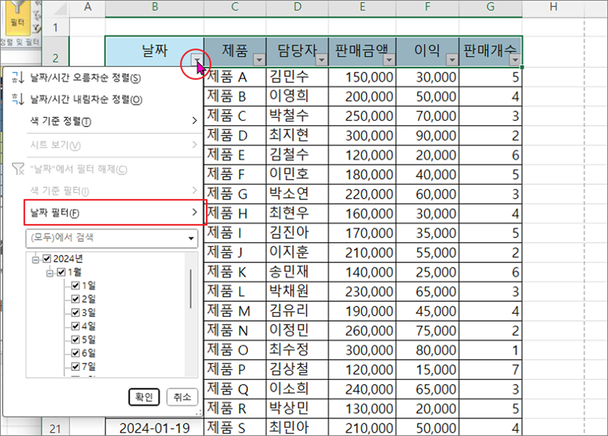 ▼ 필터 설정이 끝나면 셀 오른쪽 하단에 화살표 아이콘이 나타납니다. 아이콘을 클릭하면 셀 데이터 유형에 맞는 필터 조건이 자동으로 나타납니다. 아래 그림에서는 열 데이터 형식이 날짜라 “날짜 필터” 가 주어졌습니다.