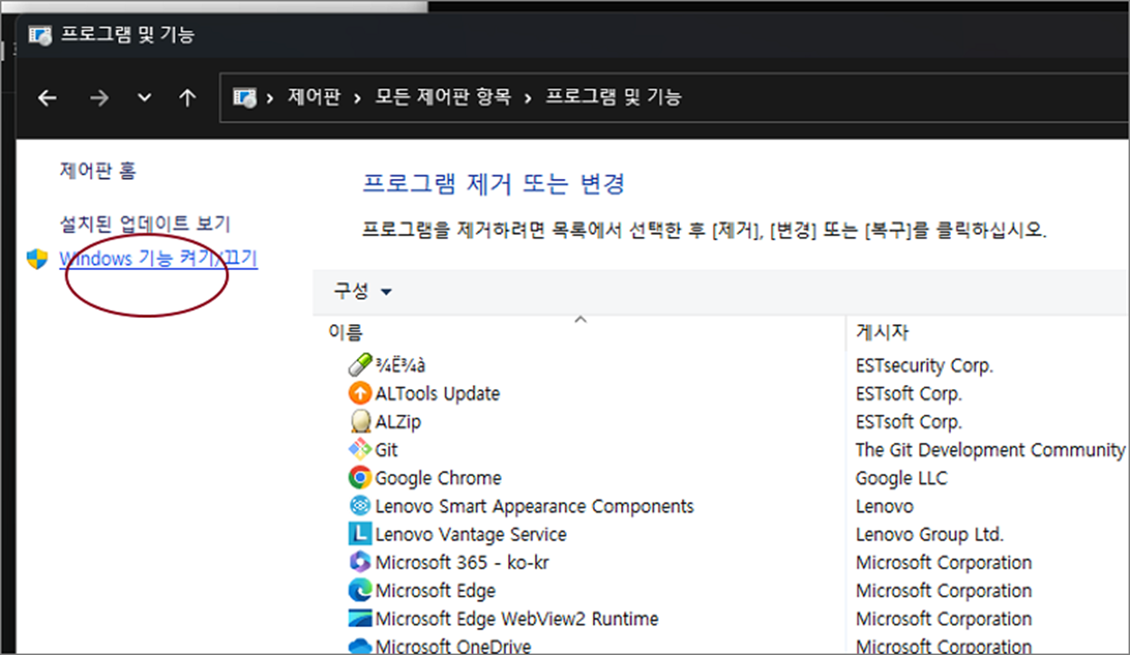 ▼ 프로그램 및 기능 화면에서 왼쪽 사이드에 “Windows 기능 켜기/끄기” 메뉴를 클릭합니다.