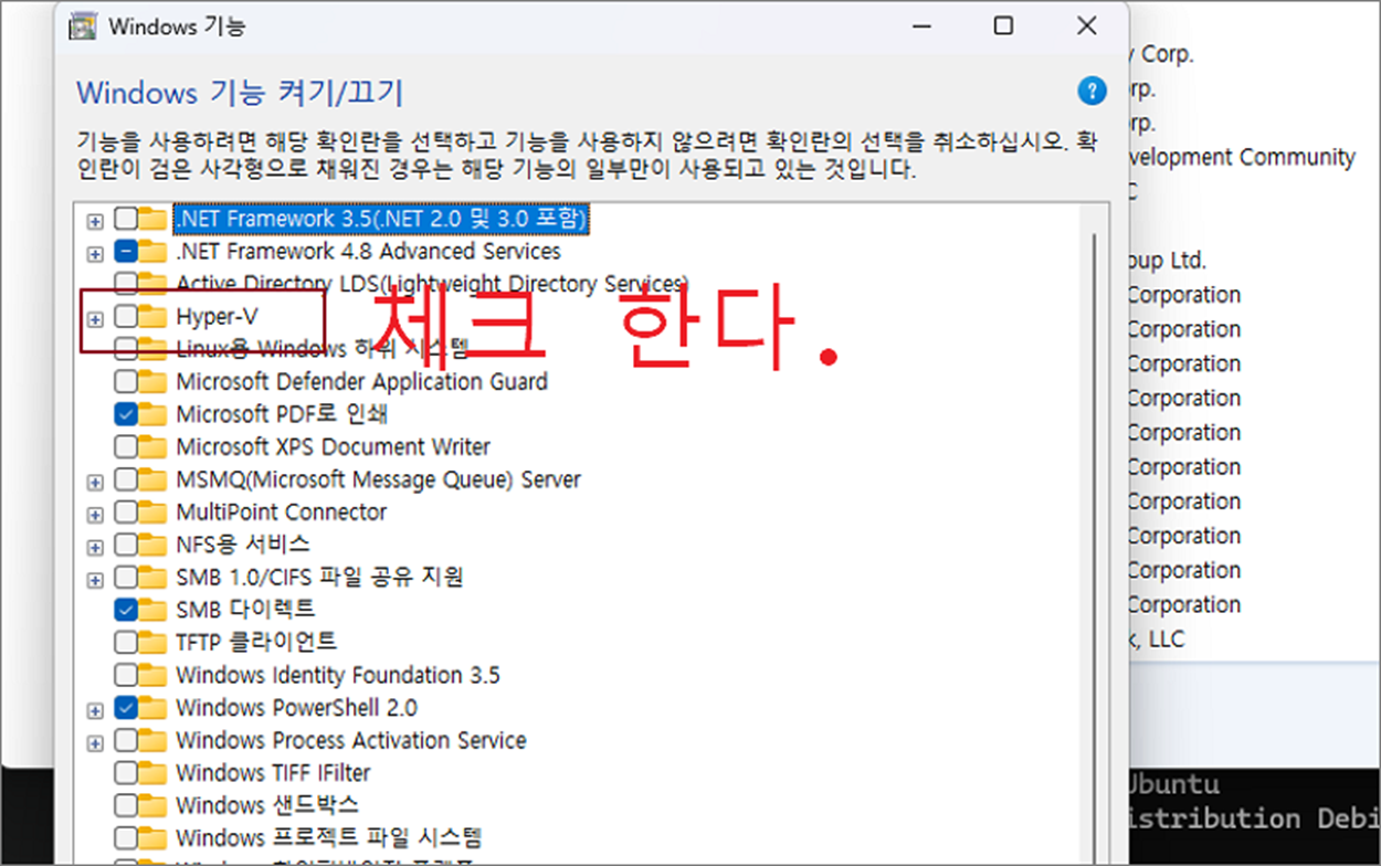 ▼ 윈도우 기능 켜기/끄기 팝업창이 뜨면 다양한 옵션 목록이 보일 겁니다. 여기에서 Hyper-V 를 찾아 체크해 줍니다.