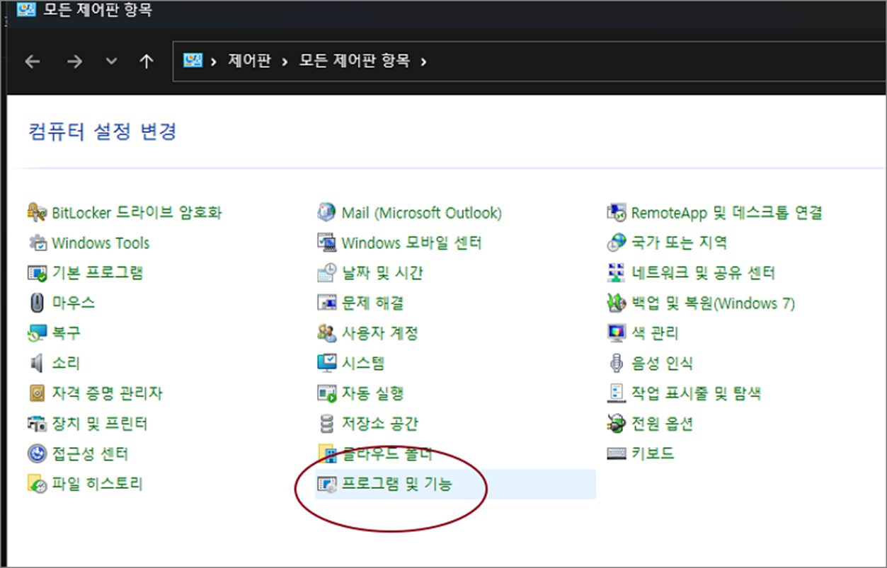 ▼ 제어판 목록에서 “프로그램 및 기능” 항목을 찾아 클릭합니다.