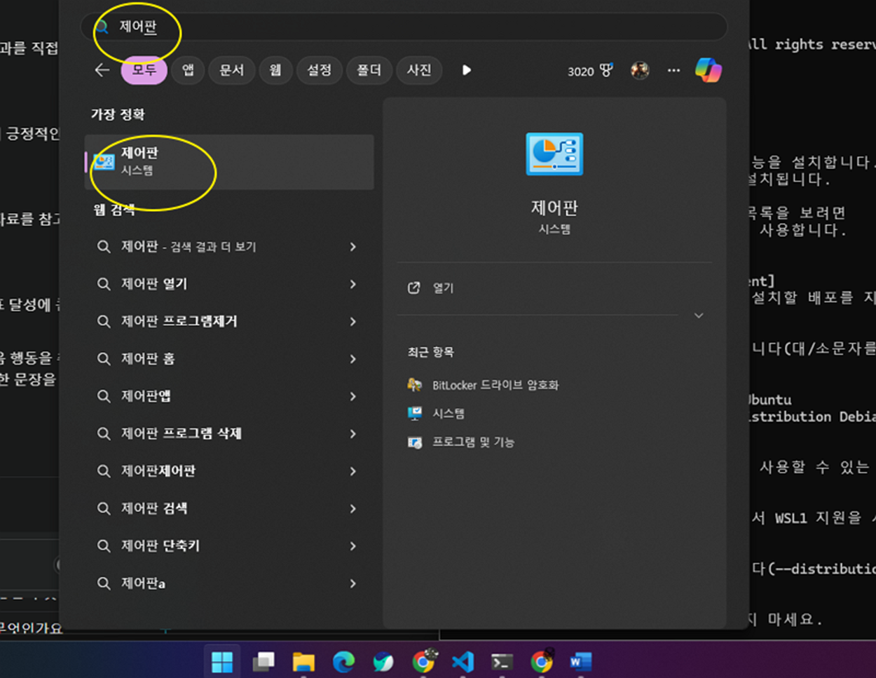 ▼ 검색에서 제어판을 찾아 실행합니다.