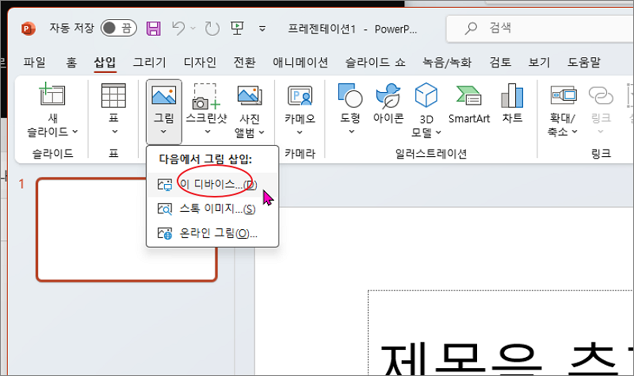 ▼ 먼저 파워포인트를 실행하고 이미지를 슬라이드에 추가해 보겠습니다. 삽입 탭 > 그림 > 이 디바이스 를 차례대로 클릭합니다. 로컬 PC 에 있는 이미지를 추가하기 위해서 입니다.