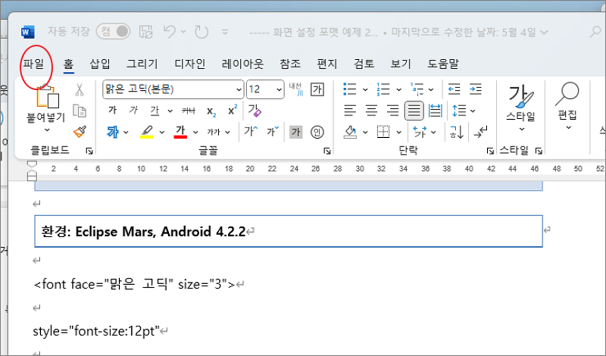 ▼ 워드를 실행하고 상단 왼쪽 끝에 “파일” 탭을 클릭합니다.