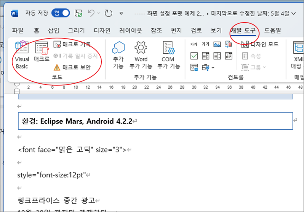 ▼ 다시 워드 화면으로 돌아서 상단 리본 메뉴 탭을 보시면 이전에 없던 “개발 도구” 를 볼 수 있을 겁니다. “개발 도구” 탭을 눌러 보세요. 안에는 매크로 관련 메뉴가 VBA 편집기를 띄울 수 있는 메뉴가 있을 겁니다.