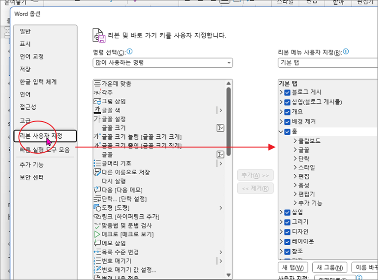 ▼ 워드 옵션창이 뜨면 왼쪽 메뉴 목록에서 “리본 사용자 지정” 을 찾아 클릭합니다. 그리고 오른쪽 화면에서 “리본 메뉴 사용자 지정” 으로 이동합니다.