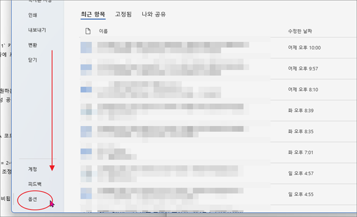 ▼ “파일” 탭으로 이동한 다음 왼쪽 사이드에 “옵션” 메뉴를 클릭합니다. 옵션 메뉴는 화면 제일 아래에 위치합니다.