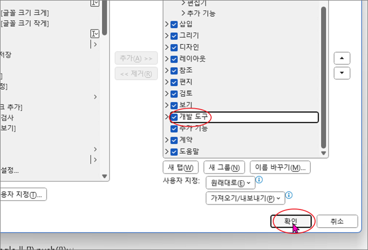 ▼ 리본 사용자 지정 목록에 보시면 체크가 안되어 있는 “개발 도구” 메뉴를 볼 수 있습니다. 체크하고 아래로 내려가서 “확인” 버튼을 클릭합니다.