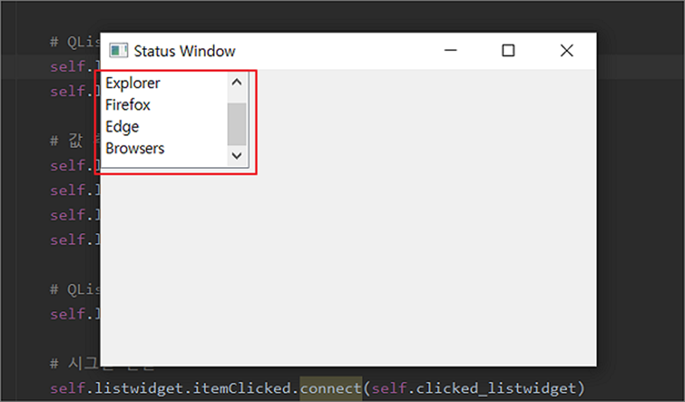 ▼ QListWidget 은 QtWidgets 모듈에 포함되어 있습니다. 리스트 위젯의 생성 방식은 다른 위젯과 동일합니다. 위젯의 크기는 resize 함수를 이용해서 조절했습니다. 위치와 크기를 한번에 지정하고 싶다면 setGeometry() 함수를 이용하세요.