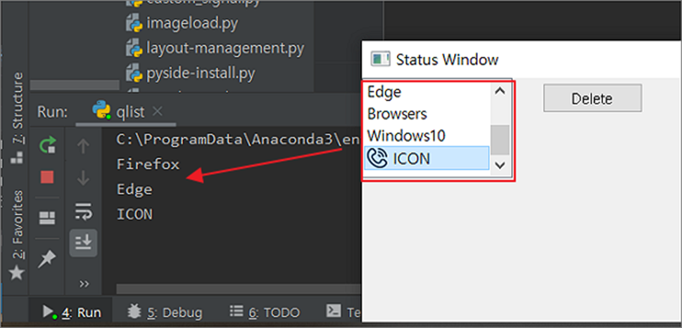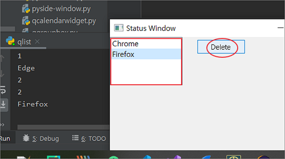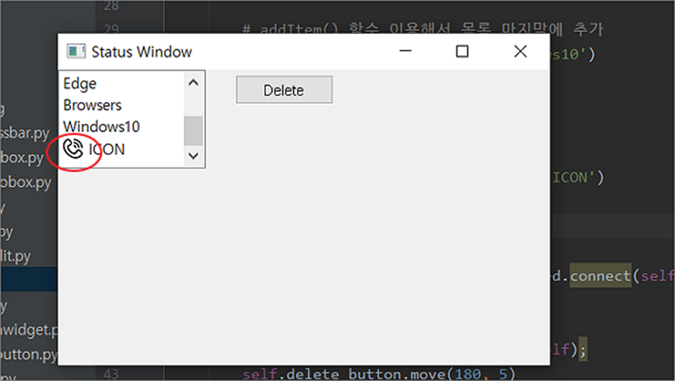 ▼ 결과 화면은 아래와 같습니다. QListWidget 바로 옆에 QPushButton 인 Delete 를 눌러 선택한 아이템을 삭제합니다.
