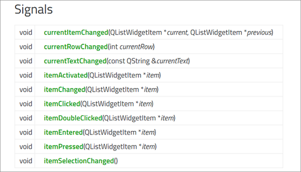 ▼ 자주 사용하는 시그널의 종류는 아래와 같습니다. 이 중에 선택이 바뀌었을 때 발생하는 itemSelectionChanged 시그널을 연결해서 로그를 찍어 보겠습니다.
