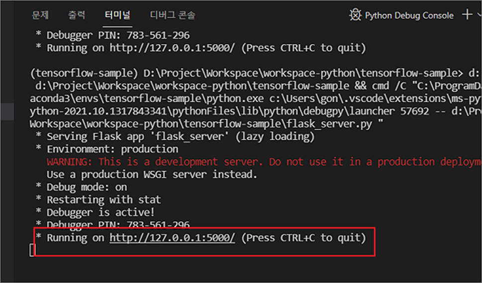 현재 실행한 server.py 의 위치는 다음과 같습니다.