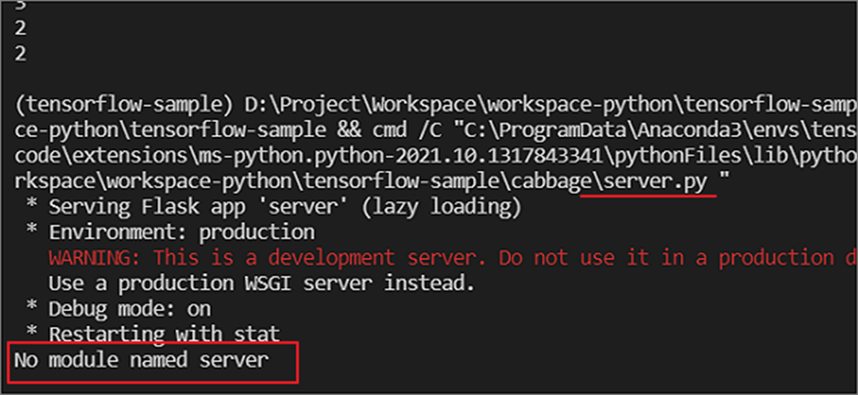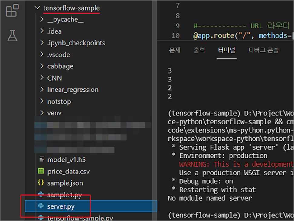 ▼ 개발 툴은 VSCode 입니다. 가상 환경에서 서버를 실행했는데 아래 그림과 같이 No module named xxxx 에러가 나는 것은 기본 애플리케이션으로 server.py 를 찾지 못해서 입니다.