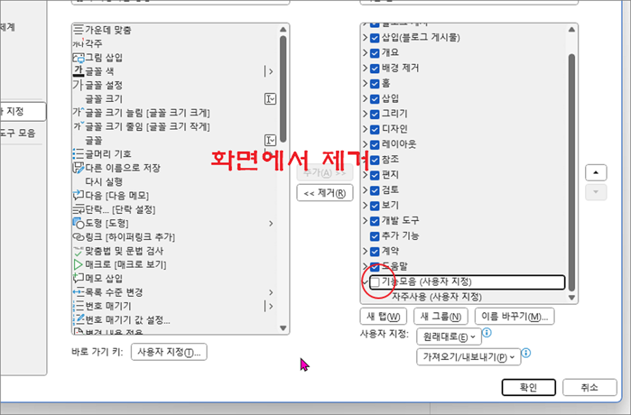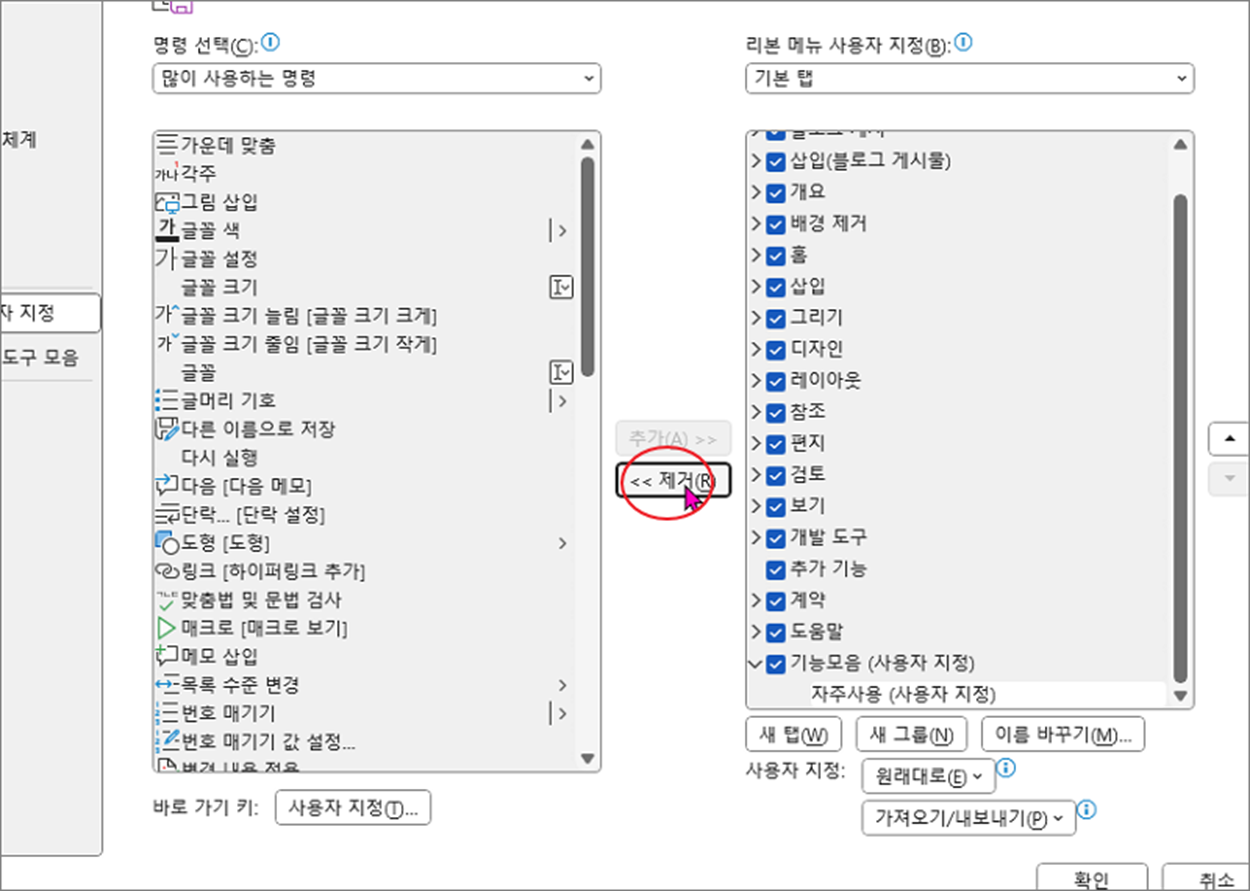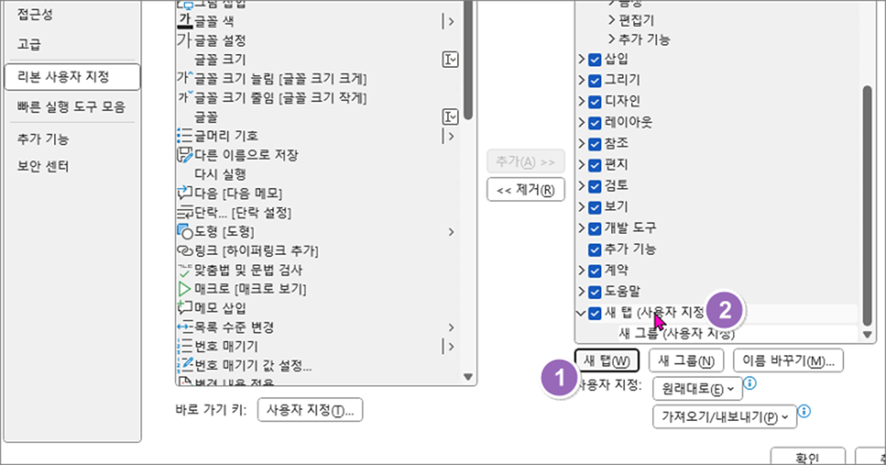 ▼ 다음은 추가한 리본 메뉴와 새 탭을 제거해 보겠습니다. 제거하고 싶은 리본 메뉴를 선택하고 중앙에 제거 버튼을 누릅니다.