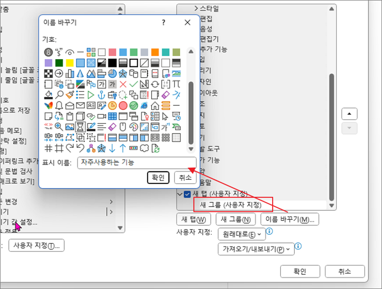 ▼ 다음 그룹에 대한 속성을 변경하겠습니다. 그룹을 선택하고 “이름 바꾸기” 메뉴를 클릭합니다. 화면에는 그룹에 추가할 기호 선택과 이름을 변경할 수 있는 팝업창이 뜹니다.
